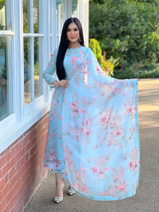 SKY BLUE FLORAL 3PC DRESS SPECIAL OFFER-PRE ORDER 2 WEEKS