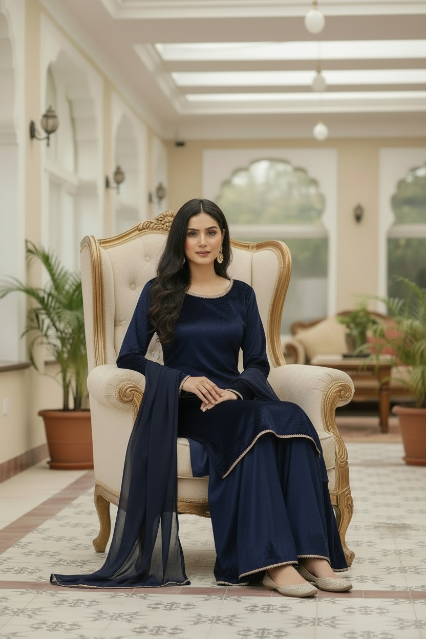 Absolutely stunning 3pc vibrant navy plazo style. This elegant outfit is ideal for any occasion. Flowy moonlight silky material. Shirt with gold lace on neckline, cuffs and daman. Chiffon dupatta with all round gold lace. Simple but yet stunning and elegant!