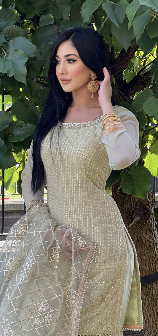 EMBROIDERED OLIVE GREEN 3PC GHARARA-3/4 WKS DELIVERY