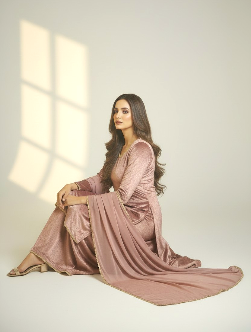 Absolutely stunning 3pc vibrant onion pink shade plazo style. This elegant outfit is ideal for any occasion. Flowy moonlight silky material. Shirt with gold lace on neckline, cuffs and daman. Chiffon dupatta with all round gold lace. Simple but yet stunning and elegant!